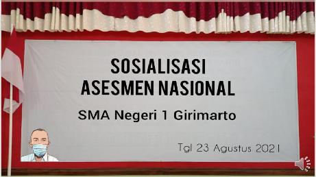Dalam rangka persiapan Asesmen Nasional (AN) di SMAN 1 Girimarto Tahun Pelajaran 2021/2022, kami mengadakan acara sosialisasi tentang AN secara virtual. Kegiatan sosialisasi ini kami sampaikan supaya anak-anak calon peserta AN lebih siap dalam menghadapi AN Tahun Pelajaran 2021/2022.Berikut adalah paparan lengkap Sosialisasi AN SMAN 1 Girimarto Tahun Pelajaran 2021/2022 yang bisa Diunduh di Sini